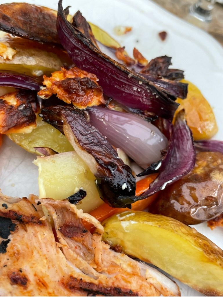 Jag lade ca 750 g kycklingfilé penslad med olivolja och soja på en plåt. På plåten även morötter ( i stavar) potatis och röd lök i klyftor samt några broccolibuketter. Lite olivolja över det och krydda med örtsalt eller salladskrydda eller det som passar dig bäst. Sätt in i ugnen ca 40 min och servera med aioli eller hummus.