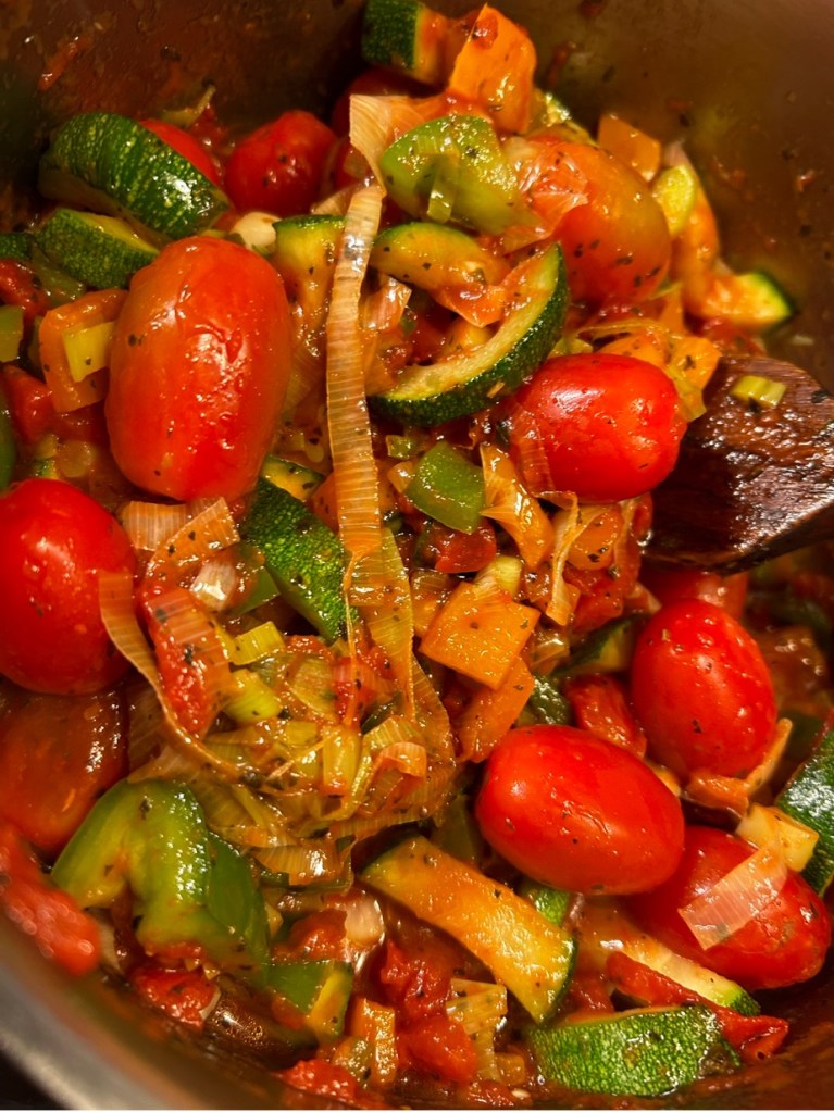 Ingredienser: 1 gul lök alt 1 purjo, 1-2 zuccini beroende på storlek, 1 paprika valfri färg, 250 g färska champinjoner, 2 msk tomatpuré, kryddor – jag valde torkad basilika, oregano och spiskummin ca 1 -2 tsk av varje samt 1 msk paprikapulver. 1 dl vitt vin alt matlagningsvin och 1 dl kokande vatten, salt