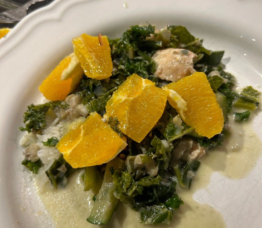 Skär zuccini i stavar och hacka lök och grönkål samt ev vitlök. Fräs sedan dessa ingredienser i olivoljan till de mjuknat och fått fin färg. Tillsätt sedan buljong och havregrädde och låt koka upp. Skär fisken i kuber och lägg sedan i den i grytan och låt koka 5- 10 min. Skär apelsinen i minde bitar och tillsätt dessa sist. Servera som den är eller för de som behöver mer kolhydrater tillsammans med rå eller vildris.