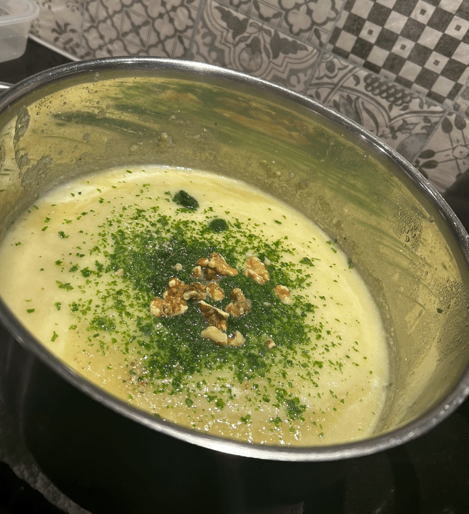 1 kg blomkål, färsk eller frusen. 1-2 gula lökar, 2 msk grönsaksbuljong. 1.5 liter vatten, persilja, valnötter, salt, peppar