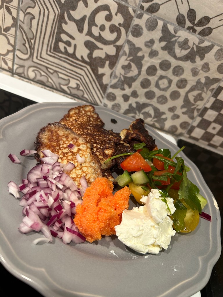 Kör ingredienserna med mixerstav och grädda som plättar med rapsolja eller smör. Servera t ex som jag med rester från helgmiddagen, röd hackad lök, sallad på ruccola, tomat och gurka samt tångkaviar.