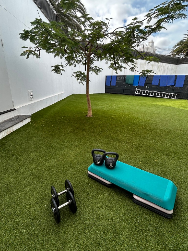 Hotellets gym har både en inne och en ute- del. Att kunna starta dagen med ett kort styrkepass och sedan lite yoga det gör mig glad i hela kroppen. För vecka 2 och några veckor framåt har jag satt som mål att köra minst 3 styrkepass (alla räknas) i veckan. Det är inte svårt att få till när det finns både en del maskiner men framför allt både hantlar, kettlebells och stepbräda som jag kombinerar med medhavda gummiband. Jag är så stolt över både mig och mina killar som tar oss upp på mornarna och tränar innan det blir för varmt.