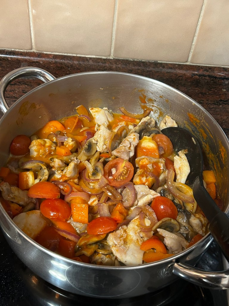 Kycklinggryta: Här är en till typisk ”man tar vad man har”- rätt. Här är proteinet ca 1 kg kycklinglårfilé som jag steker i oliv eller kokosolja och saltar. När kycklingen är genomstekt tillsätter jag 1 hackad paprika, 1 finhackad lök, 250 g skivade champinjoner och 250 g delade småtomater. Jag kryddade med färsk basilika och vitpeppar och lät koka ihop i ca 10 min. Serveras som den är eller tillsammans med ris om du behöver kolhydrateer