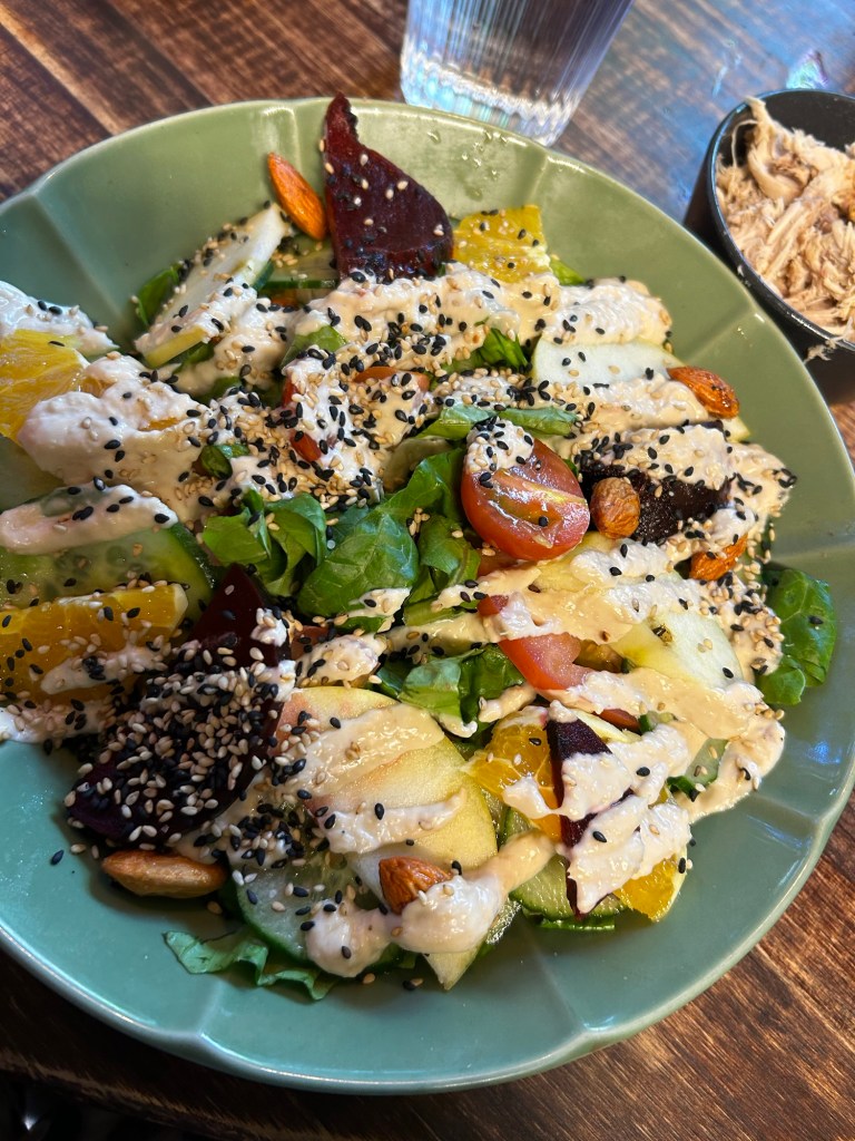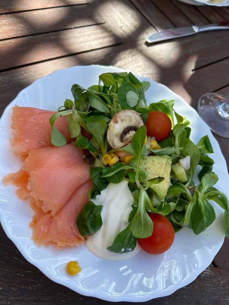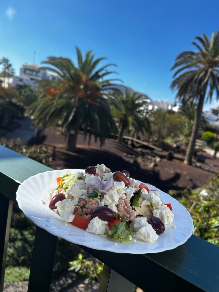 Okej- den här har vi inte lagat själva, men jag vill visa att det också finns grymt bra restaurangmat. Här en kycklingsallad på ”La Sombra Tapas” i den lilla staden Betankuria på Fuerteventura. Mycket kykling med grönsaker och lite frukt och sesamfrön. Så gott och jag höll mig mätt och pigg hela eftermiddagen.