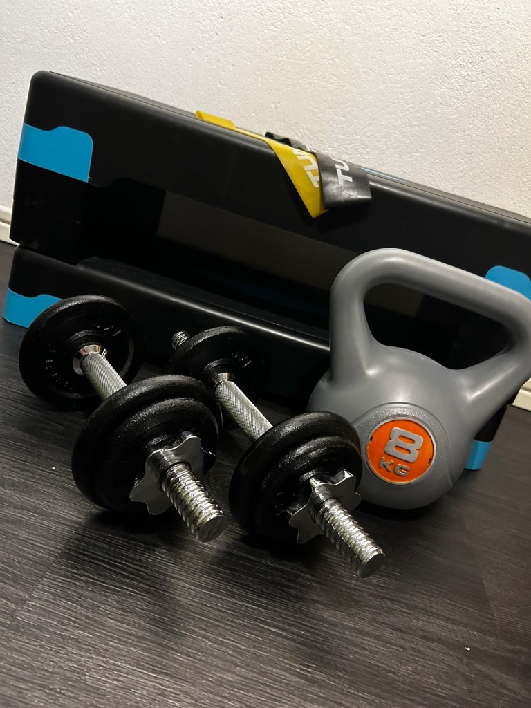 När passet inte är mer än 30-40 min tar jag mig tid och det som också passar mig är att det inte behövs några stora saker för att genomföra det. Vi har i och för sig en hel del utrustning hemma eftersom vi alla gillar att träna, men här räcker det med hantlar, gärna där man kan minska och öka vikterna för att slippa ha flera, några gummiband och antingen steplådor eller en trappa/ en stol att kliva upp på.
