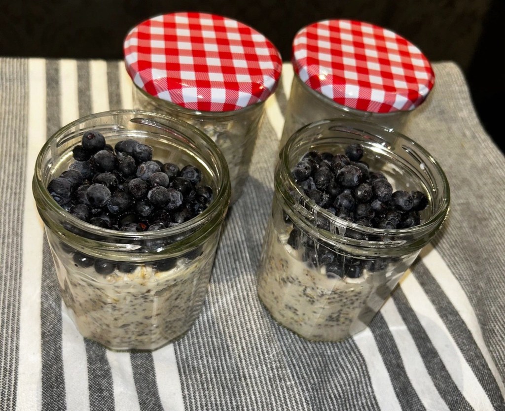 Overnights oats är ett favoritmellis i vår familj och går även att äta till frukost om det kniper. Till varje portion blandar jag 2 dl havregryn 1 -2 msk chiafrön, 2.5 dl mandeldryck eller valfri mjölk, lite salt, en nypa vaniljpulver och 1 krm kanel. Jag lägger detta i glasburkar som går att försluta väl. Har insett att det är bra med sådana där det blir tillräckligt mycket för att komplettera med 1 dl bär eller frukt i burken till servering. Då kan man ta med den till jobbet eller till träningen.