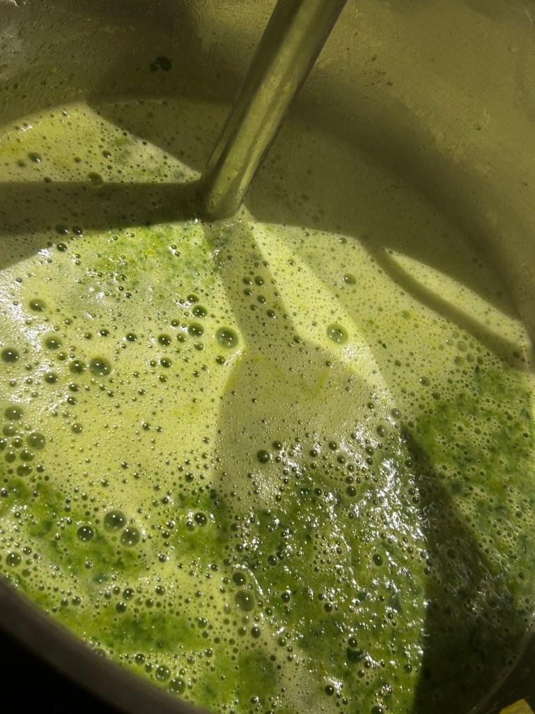 Jag fräser lök och vitlök och tillsätter sedan ärtor, buljong och det kokande vattnet. Låter det koka upp och koka i ca 10 min. Tillsätt sedan spenaten och mixa med mixerstav eller i blender. Smaka av med limejuice.