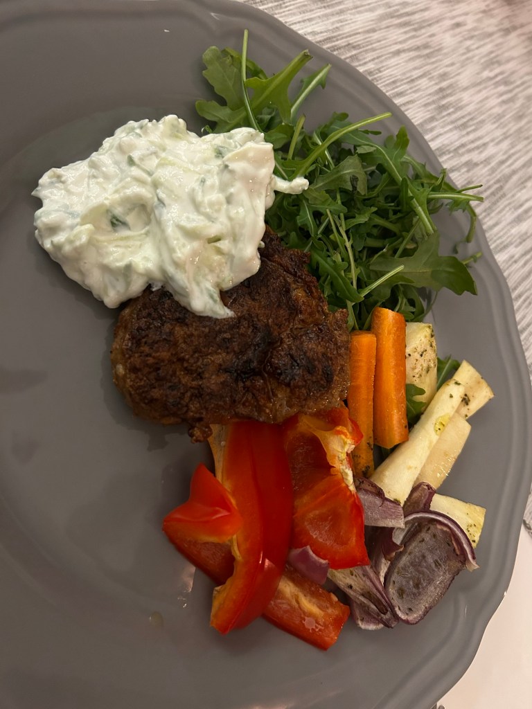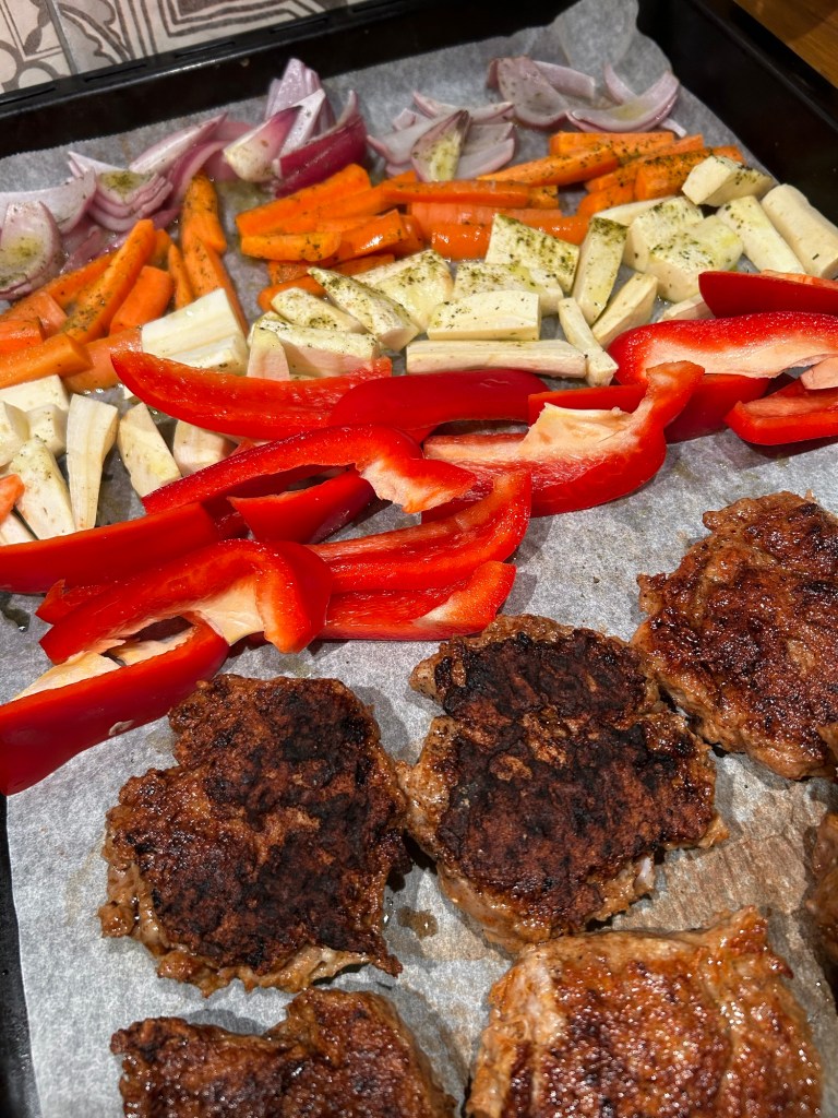 Grönsaker på plåt ca 4 port är inspirerade av Maria Borelius Hälsorevolutionen Kokboken och hennes ”veggiebox”. Jag skär och delar de grönsaker och rotfrukter som jag har, i det här fallet 2 palsternacka, 3 morötter, 1 1/2 rödlök, 1 paprika när de är bakade i ugnen på 200 grader i ca 35 min så lägger jag upp lite ruccola på en tallrik och sedan grönsaker och därefter biffen. Till det serverar jag