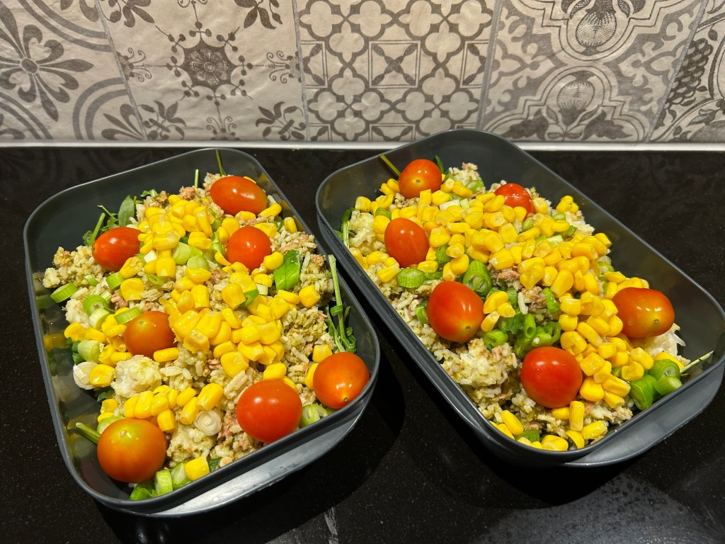 Matlådesallad är en favorit som går att variera på oändligt många sätt 🙂 Här innehåller varje portion 2 dl ”kolhydrater” dvs pasta, ris, quinoa eller dylikt i det här fallet ris som blivit över efter en middag i helgen. 200 gram protein, här tonfisk, men det kan lika gärna vara en kycklingfilé, köttfärs, ägg eller annat. När det gäller grönsaker blev det restfest men grunden är ett par nävar sallad (här ruccola) 1 dl tomater, lite salladslök, 2 dl tärnad gurka och 1 dl konserverad majs.