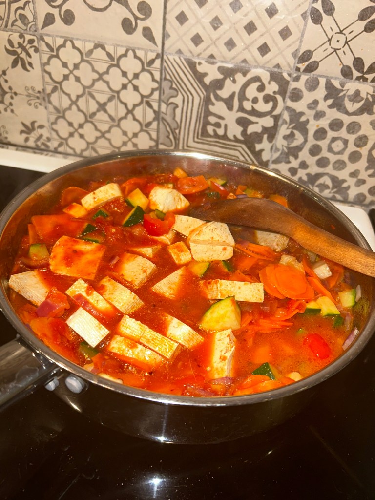 Ratatouille är en av mina favoriter och den blir godare om den får gotta till sig ett dygn eller två i kylen efter att den lagats och sedan värms i ca 10 min. Här har jag fräst 1 hackad gul lök några minuter och sedan lagt i 1 -2 tärnade zuccini (beroende på storlek) samt 2 finslantade morötter (använder mandolin) samt 1 fintärnad paprika. När det fräst ca 5 min häller jag i 400-500 g krossade tomater och 4 dl kokande vatten. Ibland tillsätter jag 1 msk buljongpulver (Renee Voltaires grönsaksbuljong. Saltar och pepprar samt tillsätter oregano eller basilika efter smak. Jag skär stavar av 300 g naturell tofu och tillsätter, låter hela grytan koka i ca 2 min.