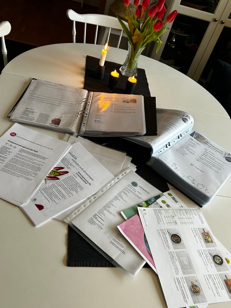 Jag började den här gången med två fulla pärmar och en ordentlig hög lösa recept. Nu sitter de jag sparat i två pärmar som är mindre fulla än tidigare. Några recept är fortfarande lösa, för jag sätter inte in dem innan jag lagat antingen receptet som det är eller mer ofta någon variant på receptet. Tror jag ska gå på jakt i mitt källarförråd och se om jag hittar en mapp där jag kan ha de lösa recepten 🙂